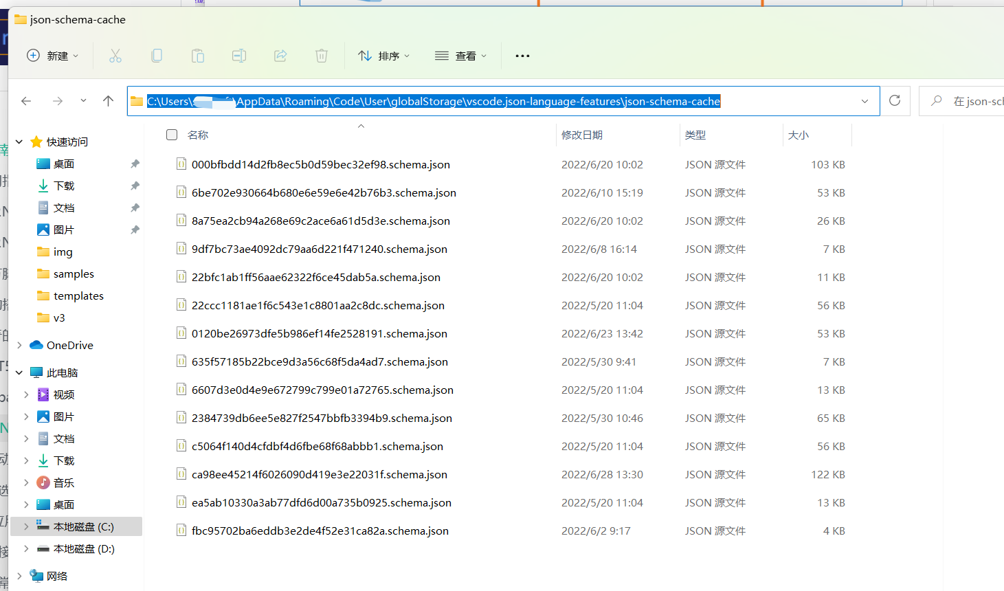 默认情况下,JSON Schema 在第一次获取之后会自动缓存起来,可能会导致 .json 文件提示错误,这个时候只需要删除缓存即可。