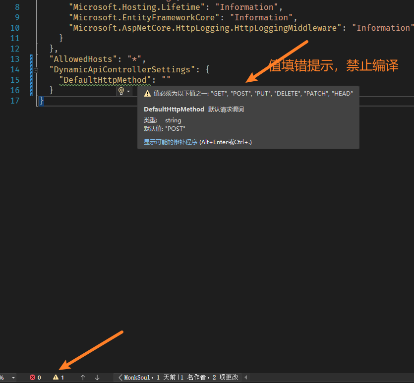Furion 框架提供了完整的 FurionASP.NET CoreJSON Schema 文件,通过该文件可以在编写配置文件时提供完整的智能提示和校验。